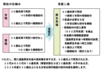 遺族厚生年金の男女差解消と、子に支給する遺族基礎年金の支給停止規定の見直しが行われました。令和10年4月から施行されます。